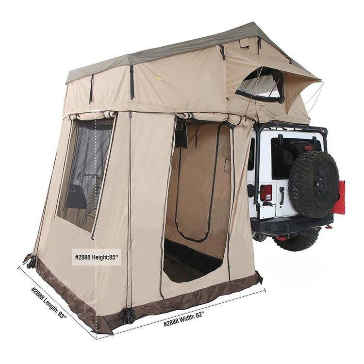 Universele tentbijlage van Smittybilt. De Smittybilt Tent Annex kan eenvoudig worden vastgemaakt aan de Smittybilt Overlander daktent om extra ruimte en privacy te bieden wanneer u dat nodig heeft. Het bijgebouw kan gemakkelijk in enkele minuten aan de overlandertent worden bevestigd met behulp van duurzame en robuuste ritsen. Gemaakt van hetzelfde duurzame met polyurethaan geïmpregneerde polyester, zal dit bijgebouw bestand zijn tegen de zware omstandigheden die worden verwacht bij verkenning over land, en is het de perfecte aanvulling op de overlandtent wanneer er extra ruimte nodig is.