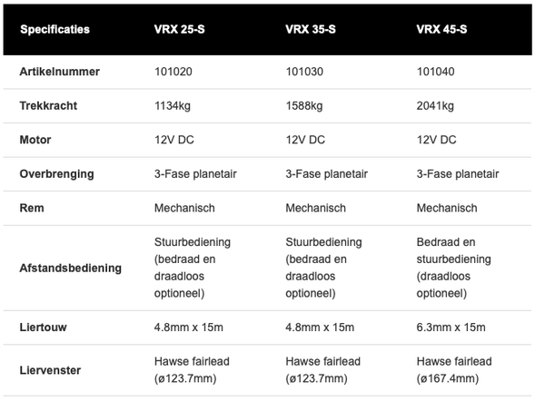 Met volledig metalen constructie, IP68 waterdichting en een volledig metalen 3-fase planetaire overbrenging. Deze lieren hebben veel functies zonder premium prijskaartje. Geweldig voor recovery op de paden als atv lier voor op uw quad, voor het zwaardere werk op de bouwplaats of voor uw boottrailer. Deze Warn VRX treklieren helpen u de grote klussen te klaren.