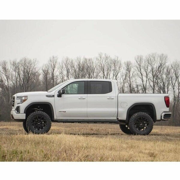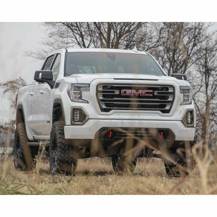 GM's 2019 Silverado en sierra heeft een indrukwekkend geheel nieuw ontwerp dat vanaf de grond af is opgebouwd, met agressieve hoeken en opvallende stylings die prachtig passen wanneer ze worden getransformeerd met Rough Country's 4-inch Suspension Lift voor Trailboss / AT4-modellen.
