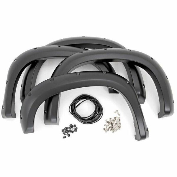 Voeg snel en gemakkelijk agressieve looks toe met de fender flares van Rough Country. Niets complimenteert een nieuwe lift, wielen en banden als een set stijlvolle, gemeen ogende wielkasten. De wielkasten van Rough Country zijn ontworpen met een gesimuleerde geklonken look. Deze spatbordaccessoires kunnen snel en eenvoudig worden vastgeschroefd op een paar veilige bevestigingspunten, waardoor de installatie een makkie wordt. Er is geen snijden of boren nodig om te installeren, en deze fakkels kunnen eenvoudig worden verwijderd en uw vrachtwagen weer op voorraad brengen! Deze UV-behandelde spatbordverbreders worden geleverd in platzwart of kunnen gemakkelijk worden geverfd om bij uw voertuig te passen, en zijn ontworpen om de zon, regen en andere elementen van de natuur te weerstaan.