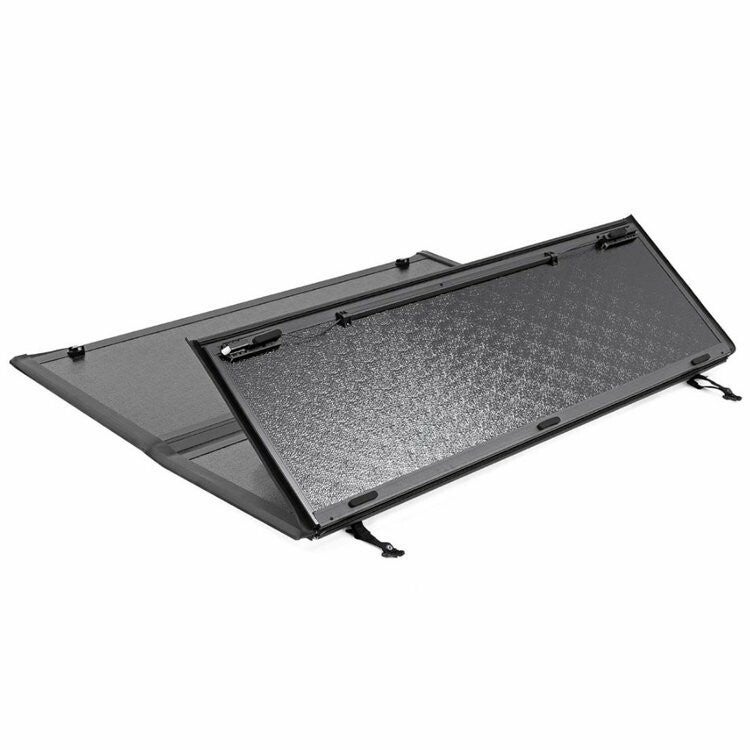 Bescherm je bed tegen weersinvloeden en potentiële dieven met Rough Country's gestroomlijnde Low Profile Hard Tri-Fold Tonneau Covers. Deze duurzame aluminium bedovertrekken van vliegtuigkwaliteit hebben een vlak ontwerp met laag profiel dat uw truck een strak, strak uiterlijk geeft en tegelijkertijd de inhoud van uw bed beschermt. Elke hoes heeft een eersteklas zwarte textuurafwerking voor compromisloze bescherming en een geweldig mooi uiterlijk. Het handige drievoudig opgevouwen ontwerp geeft u gemakkelijke toegang tot uw bed of de mogelijkheid om grote voorwerpen te vervoeren zonder de hoes volledig te verwijderen. Vouw indien nodig een of twee secties naar achteren om toegang te krijgen tot het bed, of rol het helemaal op en bevestig de duurzame opbergriemen en ga verder met de hoes in de open positie. Deze hoes is voorzien van een eenvoudig te openen kabelvergrendelingssysteem dat in de eerste en tweede positie vastklikt, zodat u niet naar de andere kant van uw vrachtwagen hoeft te lopen om de bedovertrek te openen. Het lage profiel zorgt voor een consistent geheel en laat uw voertuig er nog beter uitzien.