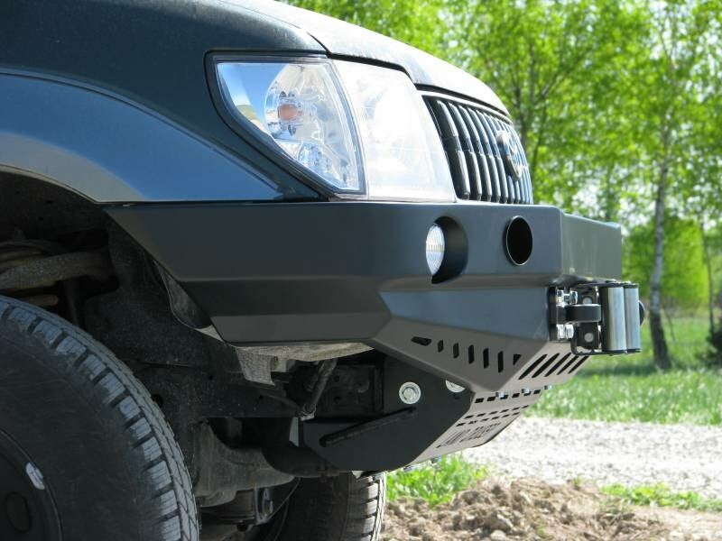 Voorbumper met lierplaat, speciaal voor de TOYOTA LAND CRUISER J90 99-02. De hoofdstructuur van de bumper is gemaakt van 3 mm dik plaatstaal en de lierplaat en de bevestigingen aan het frame zijn gemaakt van 5 mm dikke plaat. Het product wordt eerst met een laser gesneden, vervolgens gebogen op een CNC-afkantpers en tijdens handmatige afwerking wordt de juiste vorm verkregen. De volgende fase is de bescherming tegen corrosie, bestaande uit het aanbrengen van een zinkpoederprimer en een poedercoating die de bumper zijn uiteindelijke uiterlijk geeft.