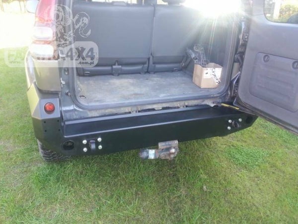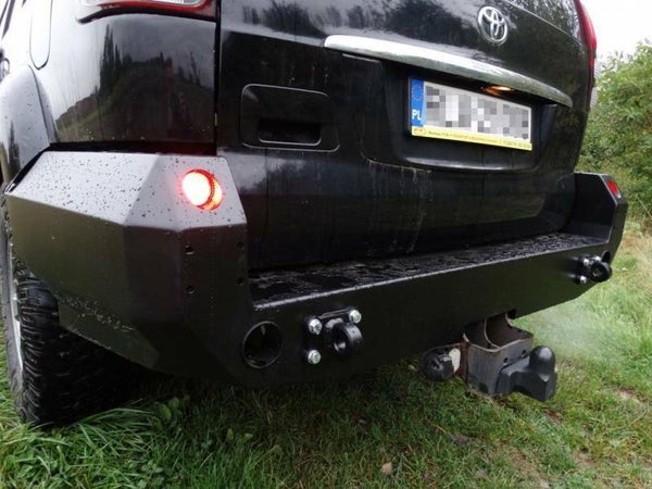Achterbumper, speciaal voor TOYOTA LAND CRUISER J120 02-09. De hoofdstructuur van de bumper is gemaakt van 4 mm dik staal en de bevestigingen aan het frame zijn 5 mm dik. Het product wordt eerst met een laser gesneden, vervolgens gebogen op een CNC-afkantpers en tijdens handmatige afwerking wordt de juiste vorm verkregen. De volgende fase is de bescherming tegen corrosie, bestaande uit het aanbrengen van een zinkpoederprimer en een poedercoating die de bumper zijn uiteindelijke uiterlijk geeft.