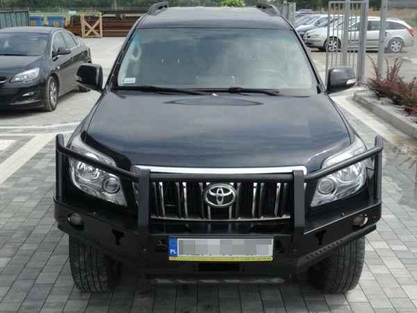 Voorbumper met lierplaat en bullbar, speciaal voor TOYOTA LAND CRUISER J150 09-13. De hoofdstructuur van de bumper is gemaakt van 3 mm tot 6 mm dik plaatstaal. Het product wordt eerst met een laser gesneden, vervolgens gebogen op een CNC-afkantpers en tijdens handmatige afwerking wordt de juiste vorm verkregen. De volgende fase is de bescherming tegen corrosie, bestaande uit het aanbrengen van een zinkpoederprimer en een poedercoating die de bumper zijn uiteindelijke uiterlijk geeft.