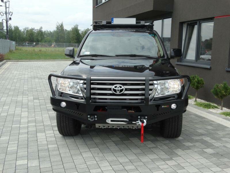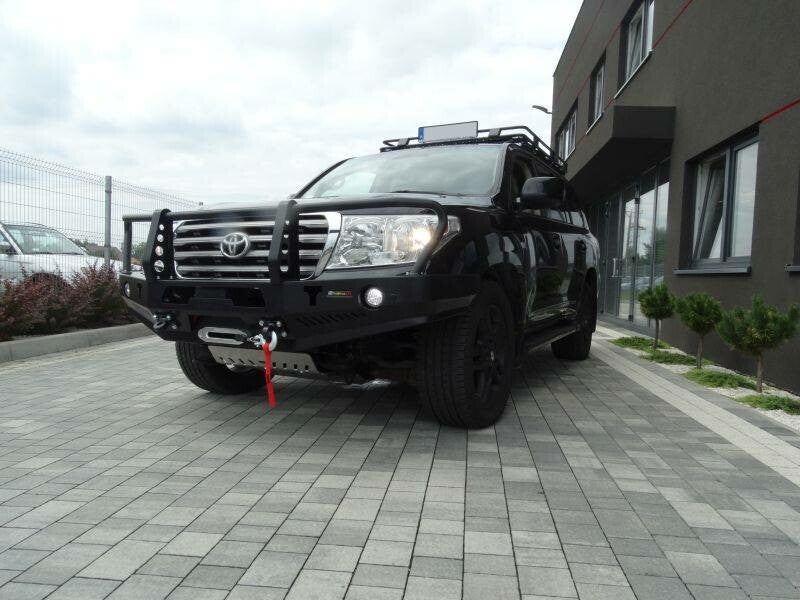 Voorbumper met een lierplaat met een bullbar (gelast), speciaal voor de TOYOTA LAND CRUISER J200 07-. De hoofdstructuur van de bumper is gemaakt van 3 mm tot 6 mm dik plaatstaal. Het product wordt eerst met een laser gesneden, vervolgens gebogen op een CNC-afkantpers en tijdens handmatige afwerking wordt de juiste vorm verkregen. De volgende fase is de bescherming tegen corrosie, bestaande uit het aanbrengen van een zinkpoederprimer en een poedercoating die de bumper zijn uiteindelijke uiterlijk geeft.