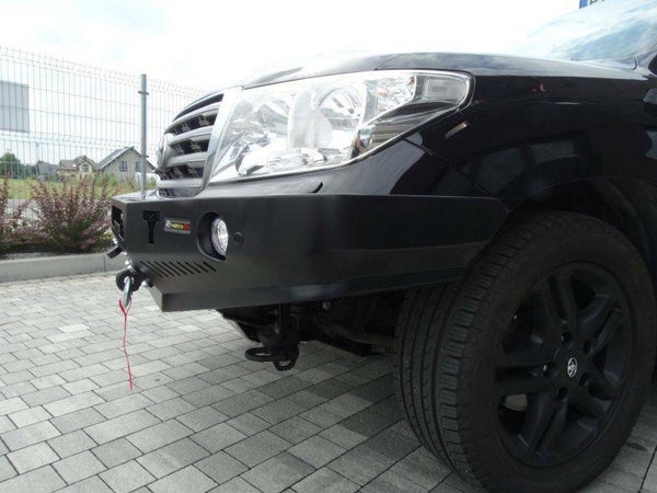Voorbumper met lierplaat zonder bullbar, speciaal voor TOYOTA LAND CRUISER J200 07-. De hoofdstructuur van de bumper is gemaakt van 3 mm tot 6 mm dik plaatstaal. Het product wordt eerst met een laser gesneden, vervolgens gebogen op een CNC-afkantpers en tijdens handmatige afwerking wordt de juiste vorm verkregen. De volgende fase is de bescherming tegen corrosie, bestaande uit het aanbrengen van een zinkpoederprimer en een poedercoating die de bumper zijn uiteindelijke uiterlijk geeft.
