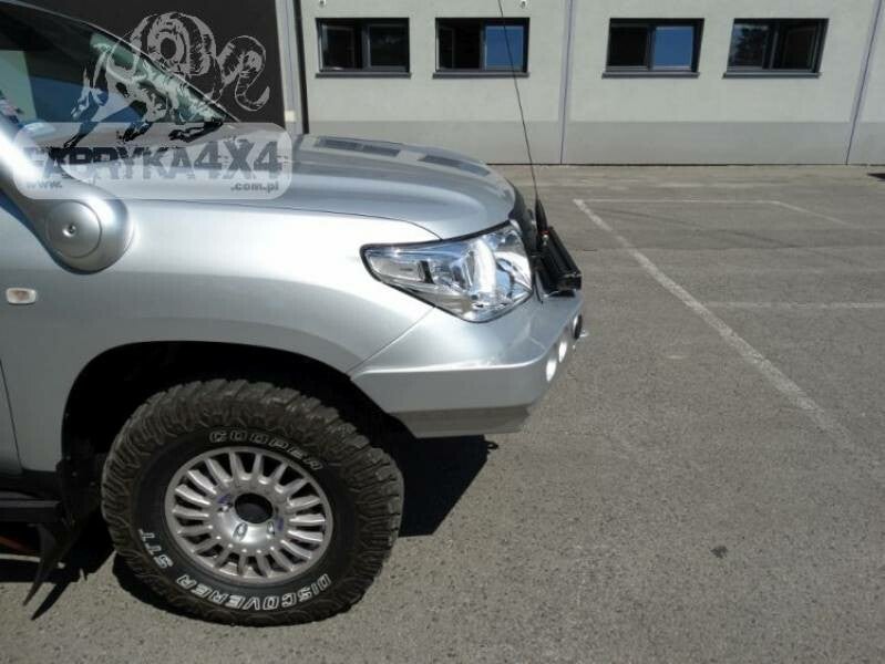 Voorbumper met lierplaat zonder bullbar, speciaal voor TOYOTA LAND CRUISER J200 2007 tot heden. De hoofdstructuur van de bumper is gemaakt van 4 mm dik plaatstaal en de lierplaat en de framebevestigingen zijn gemaakt van 5 mm dik plaatstaal. Het product wordt eerst met een laser gesneden, vervolgens gebogen op een CNC-afkantpers en tijdens handmatige afwerking wordt de juiste vorm verkregen. De volgende fase is de bescherming tegen corrosie, bestaande uit het aanbrengen van een zinkpoederprimer en een poedercoating die de bumper zijn uiteindelijke uiterlijk geeft.