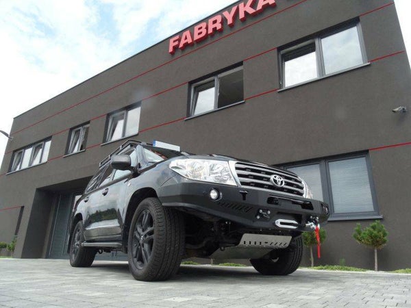 Voorbumper met lierplaat zonder bullbar, speciaal voor TOYOTA LAND CRUISER J200 07-. De hoofdstructuur van de bumper is gemaakt van 3 mm tot 6 mm dik plaatstaal. Het product wordt eerst met een laser gesneden, vervolgens gebogen op een CNC-afkantpers en tijdens handmatige afwerking wordt de juiste vorm verkregen. De volgende fase is de bescherming tegen corrosie, bestaande uit het aanbrengen van een zinkpoederprimer en poedercoating die de bumper zijn uiteindelijke uiterlijk geeft.