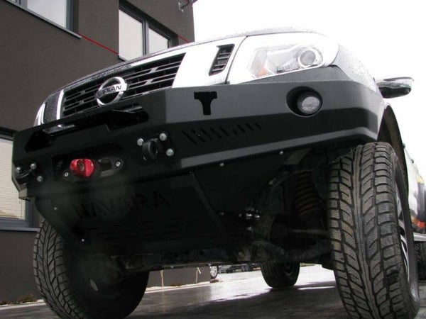 Voorbumper met een lierplaat zonder bullbar, speciaal voor de auto NISSAN NAVARA D23 2014-. De hoofdstructuur van de bumper is gemaakt van 3 mm tot 6 mm dik plaatstaal. Het product wordt eerst met een laser gesneden, vervolgens gebogen op een CNC-afkantpers en tijdens handmatige afwerking wordt de juiste vorm verkregen. De volgende fase is de bescherming tegen corrosie, bestaande uit het aanbrengen van een zinkpoederprimer en poedercoating die de bumper zijn uiteindelijke uiterlijk geeft.